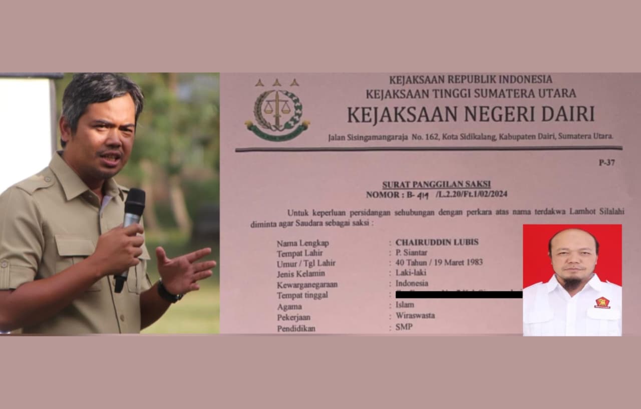 Pada surat panggilan Saksi yang dikeluarkan oleh Kejari Dairi tersebut, Pendidikan Chairuddin Lubis dituliskan SMP, dan surat panggilan itu dikeluarkan pada 17 April 2024.