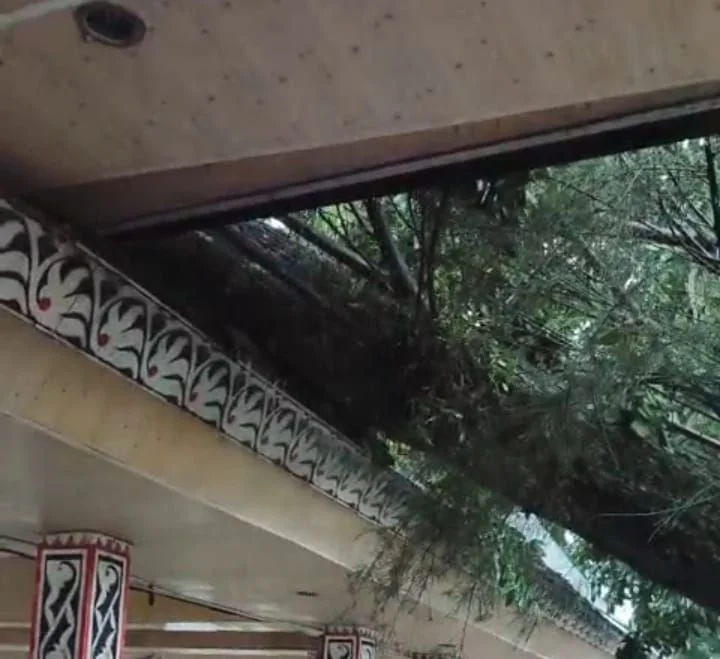 Gbr : Pohon tumbang menimpa Balai Bolon lapangan Haji Adam Malik Pematangsiantar, akibat hujan deras diiringi angin kencang, Selasa (23/9/2025).
