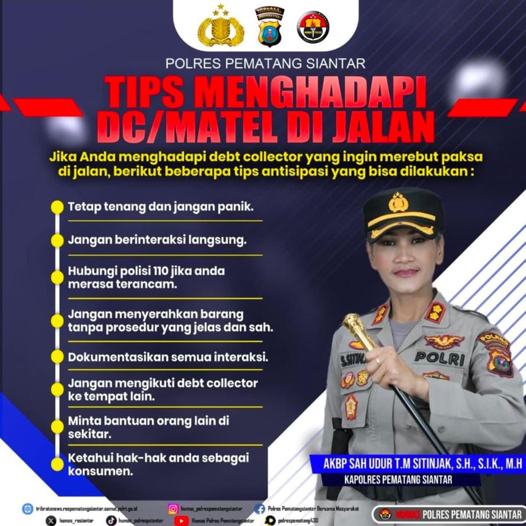 Kapolres Pematangsiantar AKBP. Sah Udur T. M. Sitinjak S.H., S.I.K., M.H., mengeluarkan himbauan tips untuk menghadapi DebtColector/Matel di Jalan. Dikutip dari akun medsos Polres Pematangsiantar, Kapolres memberikan beberapa tips jitu untuk menghadapi Matel.